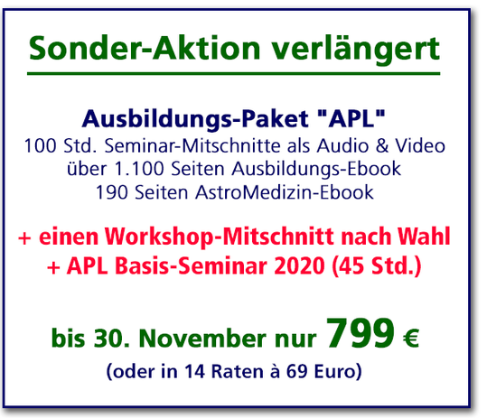 Je nach Ihren finanziellen Möglichkeiten... und je nachdem wie tief Sie in die AstroPolarity-Lehre von Peter-Johannes Hensel einsteigen möchten... bieten wir drei Ausbildungs-Pakete an. In jedem dieser Pakete sind die APL-Ausbildung, das APL Basis-Seminar und ein Workshop-Mitschnitt nach Wahl enthalten - in den Premium-Varianten gibt es zusätzlich noch weitere Ausbildungen/Seminare sowie mehrere Workshop-Mitschnitte.