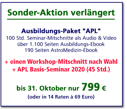 Je nach Ihren finanziellen Möglichkeiten... und je nachdem wie tief Sie in die AstroPolarity-Lehre von Peter-Johannes Hensel einsteigen möchten... bieten wir drei Ausbildungs-Pakete an. In jedem dieser Pakete sind die APL-Ausbildung, das APL Basis-Seminar und ein Workshop-Mitschnitt nach Wahl enthalten - in den Premium-Varianten gibt es zusätzlich noch weitere Ausbildungen/Seminare sowie mehrere Workshop-Mitschnitte.