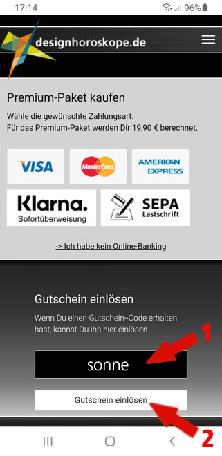 Es ändert sich dann links im grauen Kasten der Preis für das Premium-Paket von 19,90 Euro auf nur 10,00 € - jetzt kannst Du deine gewünschte Zahlungsart auswählen und bezahlen (sollte sich bei Dir der Preis nicht geändert haben, so hast Du nach Eingabe von "sonne" nicht auf "Gutschein einlösen" geklickt)