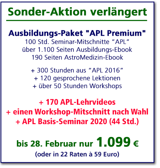 Beim gleichzeitigen Erwerb des großen Astrologie-Paketes "APL Premium", des APL-Masterseminars und des APL Berater-Praxistrainings können Sie in diesem Monat von einem 800 Euro-Rabatt profitieren, denn Sie erhalten als Bonus zusätztlich alle Inhalte von "Premium-Spezial" auf USB-Sticks.