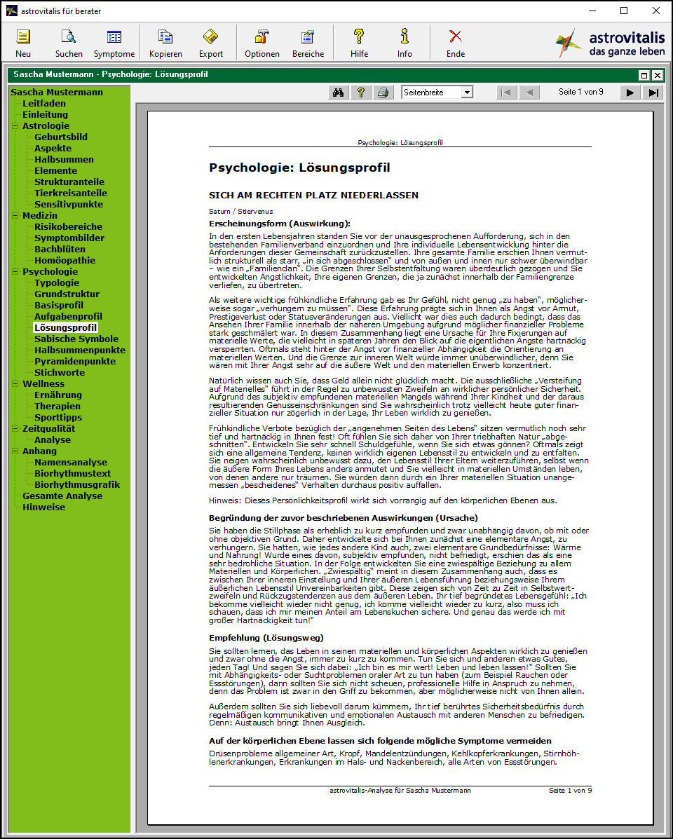 ABER... wenn Sie mit nur einem Klick möglichst viel über sich und andere Menschen erfahren möchten... wenn Sie für einen beliebigen Zeitpunkt wissen wollen, welche Aufgaben das Leben einem Menschen stellt... und Sie Wert auf seriöse & tiefgründige Textee legen... deren Umfang Sie per Klick beliebig festlegen können... Texte, die Ihnen die wahren Ursachen und auf die jeweilige Person zugeschnittene Lösungswege liefern... welche auch den psychologischen und den astro-medizinischen Bereich umfassen... wenn Sie sich viele Erläuterungen zu den Deutungs-Texten wünschen... und Sie ein Programm suchen, das stabil unter Windows läuft (Windows 11, Windows 10, Windows 8 oder Windows 7)...