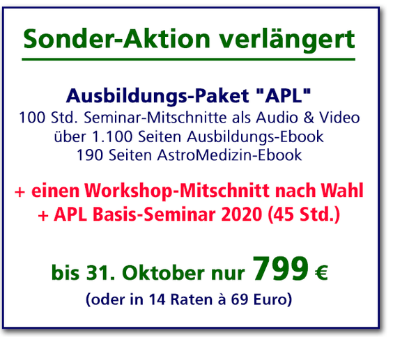 Je nach Ihren finanziellen Möglichkeiten... und je nachdem wie tief Sie in die AstroPolarity-Lehre von Peter-Johannes Hensel einsteigen möchten... bieten wir drei Ausbildungs-Pakete an. In jedem dieser Pakete sind die APL-Ausbildung, das APL Basis-Seminar und ein Workshop-Mitschnitt nach Wahl enthalten - in den Premium-Varianten gibt es zusätzlich noch weitere Ausbildungen/Seminare sowie mehrere Workshop-Mitschnitte.