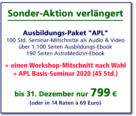 Je nach Ihren finanziellen Möglichkeiten... und je nachdem wie tief Sie in die AstroPolarity-Lehre von Peter-Johannes Hensel einsteigen möchten... bieten wir drei Ausbildungs-Pakete an. In jedem dieser Pakete sind die APL-Ausbildung, das APL Basis-Seminar und ein Workshop-Mitschnitt nach Wahl enthalten - in den Premium-Varianten gibt es zusätzlich noch weitere Ausbildungen/Seminare sowie mehrere Workshop-Mitschnitte.