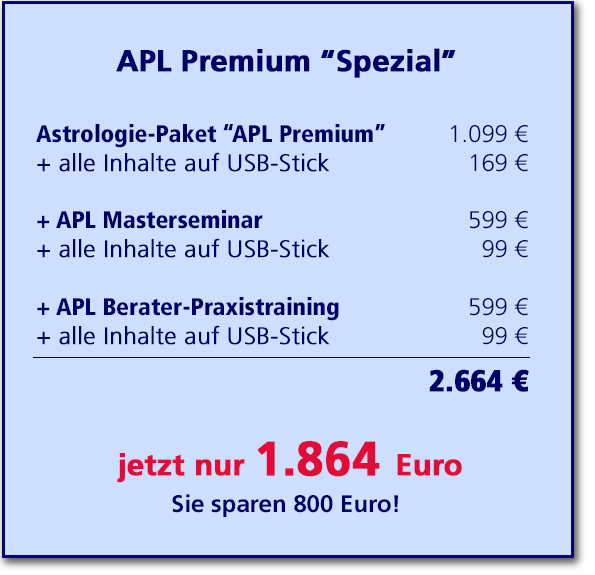 Beim gleichzeitigen Erwerb des großen Astrologie-Paketes "APL Premium", des APL-Masterseminars und des APL Berater-Praxistrainings können Sie von einem 800 Euro-Rabatt profitieren.